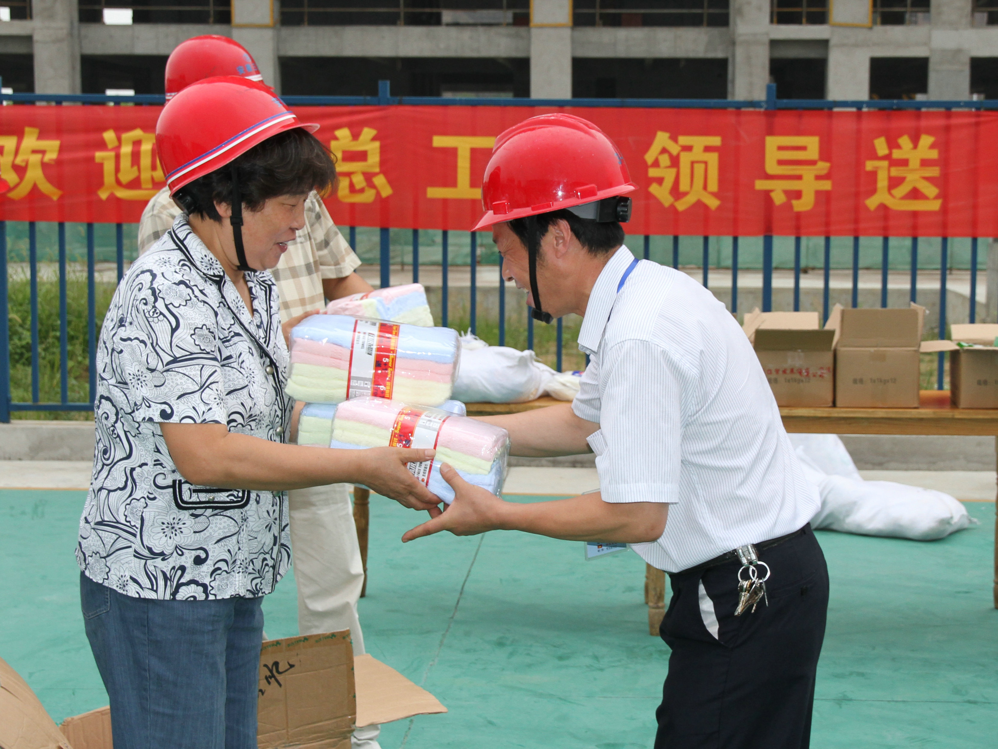 牛和桂同志仔細詢(xún)問(wèn)了工程進(jìn)展情況、勞動(dòng)保護和安全保障工作的開(kāi)展情況,察看了項目部施工現場(chǎng)和辦公生活區,親手將防暑降溫用品送到職工手中,對廣大職工在高溫季節奮戰在一線(xiàn)表示親切的慰問(wèn),感謝大家為城市建設做出了巨大貢獻,她指出,建工集團是我省建筑業(yè)龍頭企業(yè),各項管理較為規范,項目工程標準化管理起點(diǎn)早,標準高;集團公司始終把關(guān)心農民工的工作生活放在首位,廣大農民工群體已成為企業(yè)核心職工一部分,她對集團公司項目管理工作取得的成績(jì)給予肯定,表示贊許。她希望大家保重身體,注意安全,各級工會(huì )組織要協(xié)助行政做好高溫季節防暑降溫工作,把職工的安全健康放在首位;要根據項目部實(shí)際,因地制宜深入開(kāi)展“安康杯”競賽活動(dòng),做好勞動(dòng)保護工作,齊心協(xié)力,保質(zhì)保量完成施工生產(chǎn)任務(wù)。