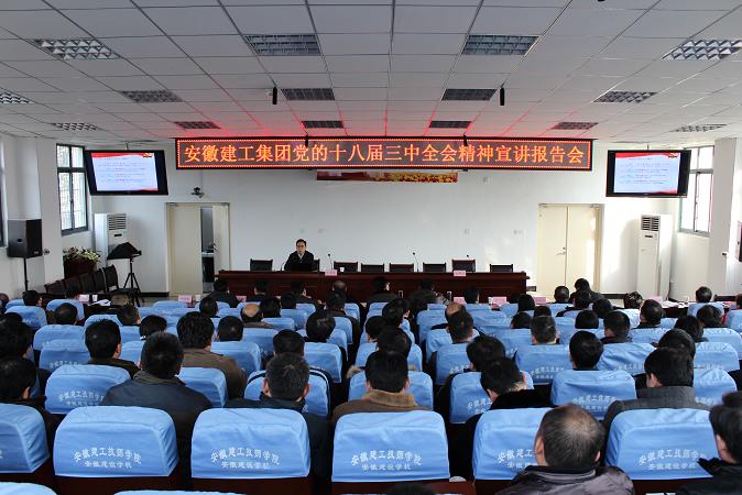 2月21日上午,省國資委黨的十八屆三中全會(huì )精神宣講團來(lái)到安徽建工集團作專(zhuān)場(chǎng)宣講。宣講團成員、省國資委綜合法規處處長(cháng)王思軍同志作專(zhuān)題報告,省國資委組宣處副處長(cháng)秦正敏出席報告會(huì )。集團公司領(lǐng)導全體成員、集團機關(guān)部門(mén)負責人,所屬各單位、直屬經(jīng)濟實(shí)體領(lǐng)導班子成員,共 140余人聆聽(tīng)了報告。