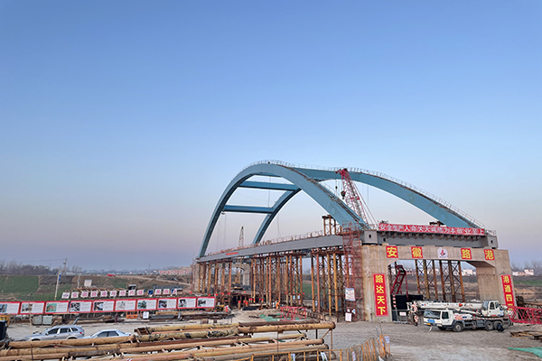 S328楊橋泉河大橋是阜陽(yáng)市臨泉縣“十三五”重點(diǎn)建設項目,S328北段改建工程的控制性工程,主橋采用135m下承式鋼箱拱橋,鋼結構用量為2928t,主拱高度為26.4m。針對安全風(fēng)險高、施工難度大、技術(shù)質(zhì)量要求高等諸多難題,項目部周密組織、精心實(shí)施,確保主橋順利施工。目前主橋拱肋已合龍,正在進(jìn)行橋面板安裝施工,確保春節前主橋完工。