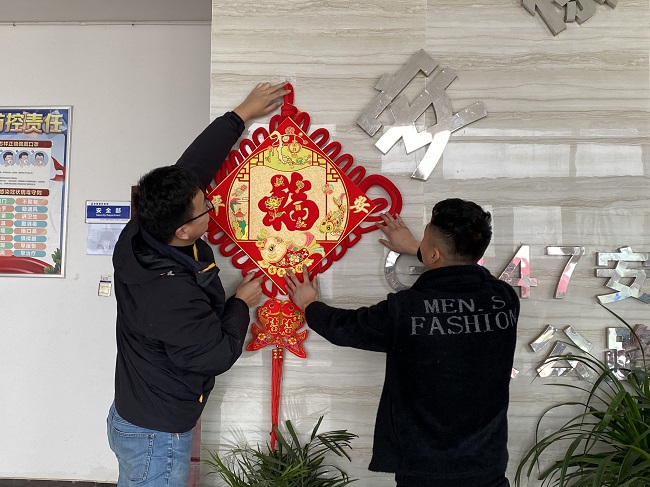 為了將“年味”注入進(jìn)每一個(gè)不能回家的員工心中,讓新年更有煙火氣、儀式感,項目部掛中國結、貼春聯(lián)、送福字,為做好疫情防控工作就地過(guò)年的一線(xiàn)建設者增添“年味”。員工們聚在一起喜迎新年,互相祝福,年味濃濃,感受著(zhù)新春的溫暖,營(yíng)造了春節喜慶祥和的節日氛圍。
