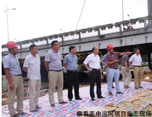 趙總一行首先查看了澛港閘(橋)項目、蕪申運河項目施工現場(chǎng),仔細詢(xún)問(wèn)了防汛措施及項目進(jìn)展情況。在澛港閘(橋)項目部會(huì )議室,分別聽(tīng)取了項目部、水利分公司、安徽水利股份關(guān)于項目管理情況匯報。