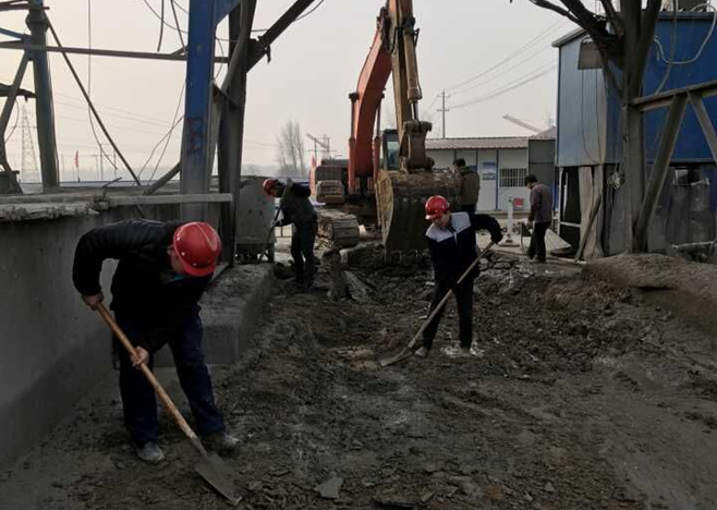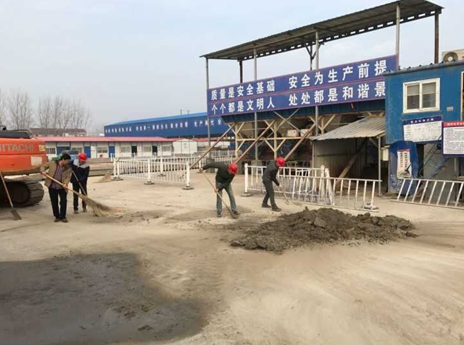 在后場(chǎng)的場(chǎng)站大門(mén)、分區隔離帶、拌合站等處,突擊隊員們有的掃、有的鏟、有的運、有的推,個(gè)個(gè)干勁使足,有條不紊地對各處的塵土、淤泥、結塊混凝土進(jìn)行清理。