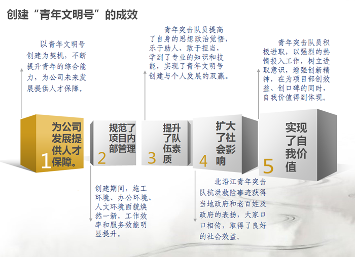 爭創(chuàng )活動(dòng)中,主要圍繞8個(gè)方面開(kāi)展工作。一是建立以突擊隊隊長(cháng)為負責人的創(chuàng )建領(lǐng)導小組,定期組織上團課,加強隊員思想教育;二是開(kāi)展“我為重點(diǎn)工程獻青春”為主題的勞動(dòng)競賽活動(dòng),激發(fā)團員青年的拼搏奉獻精神;三是建立健全創(chuàng )建檔案,做好資料留存;四是以服務(wù)青年為中心,以提高工作質(zhì)量和效率為重點(diǎn),創(chuàng )新工作模式;五是做好“師帶徒”,抓好“傳、幫、帶”, 設定青年人才培養目標,促進(jìn)青年崗位成才;六是成立青年志愿者服務(wù)隊,開(kāi)展志愿幫扶;七是建立青年安全監督崗,助力安全生產(chǎn);八是結合項目實(shí)際,組織開(kāi)展文體活動(dòng)。