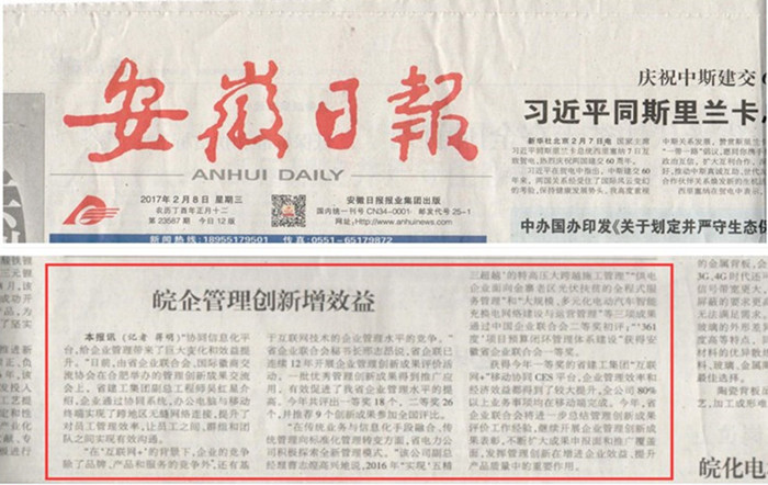 2月8日,《安徽日報》在產(chǎn)經(jīng)新聞版塊中發(fā)表《皖企管理創(chuàng )新增效益》一文,文章高度評價(jià)集團CES協(xié)同平臺建設成效。