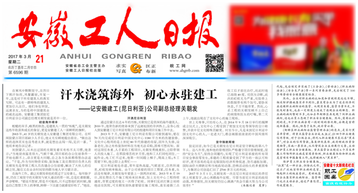 《安徽工人日報》頭版報道安建海外勞模關(guān)朝發(fā)先進(jìn)事跡