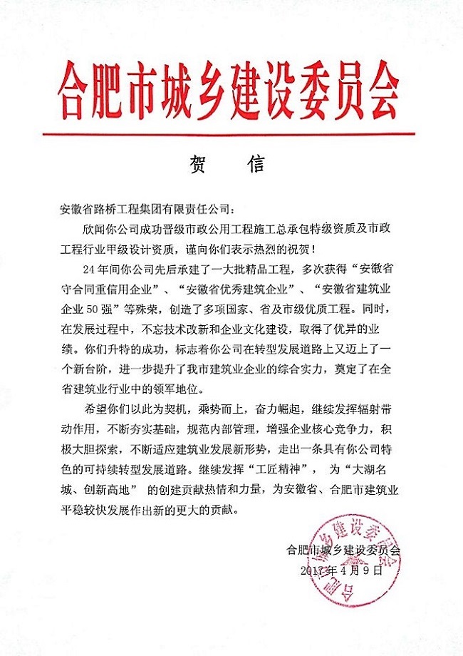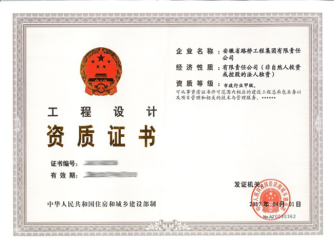 4月1日,經(jīng)國家住建部核準,安徽路橋集團成功獲得市政公用工程施工總承包特級資質(zhì)及市政行業(yè)甲級設計資質(zhì)。將公司“十三五”戰略規劃末期計劃實(shí)施的宏偉藍圖,提前繪就!