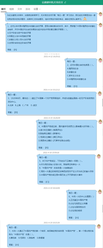 形式多樣、內容鮮活、入腦入心,是安建建材機關(guān)黨總支開(kāi)展黨史學(xué)習教育的鮮明特色。為了確保學(xué)習有重點(diǎn)、有載體、有平臺,機關(guān)黨總支還開(kāi)展了“每日一題”黨史學(xué)習活動(dòng),依托線(xiàn)上平臺將黨史教育落到實(shí)處。