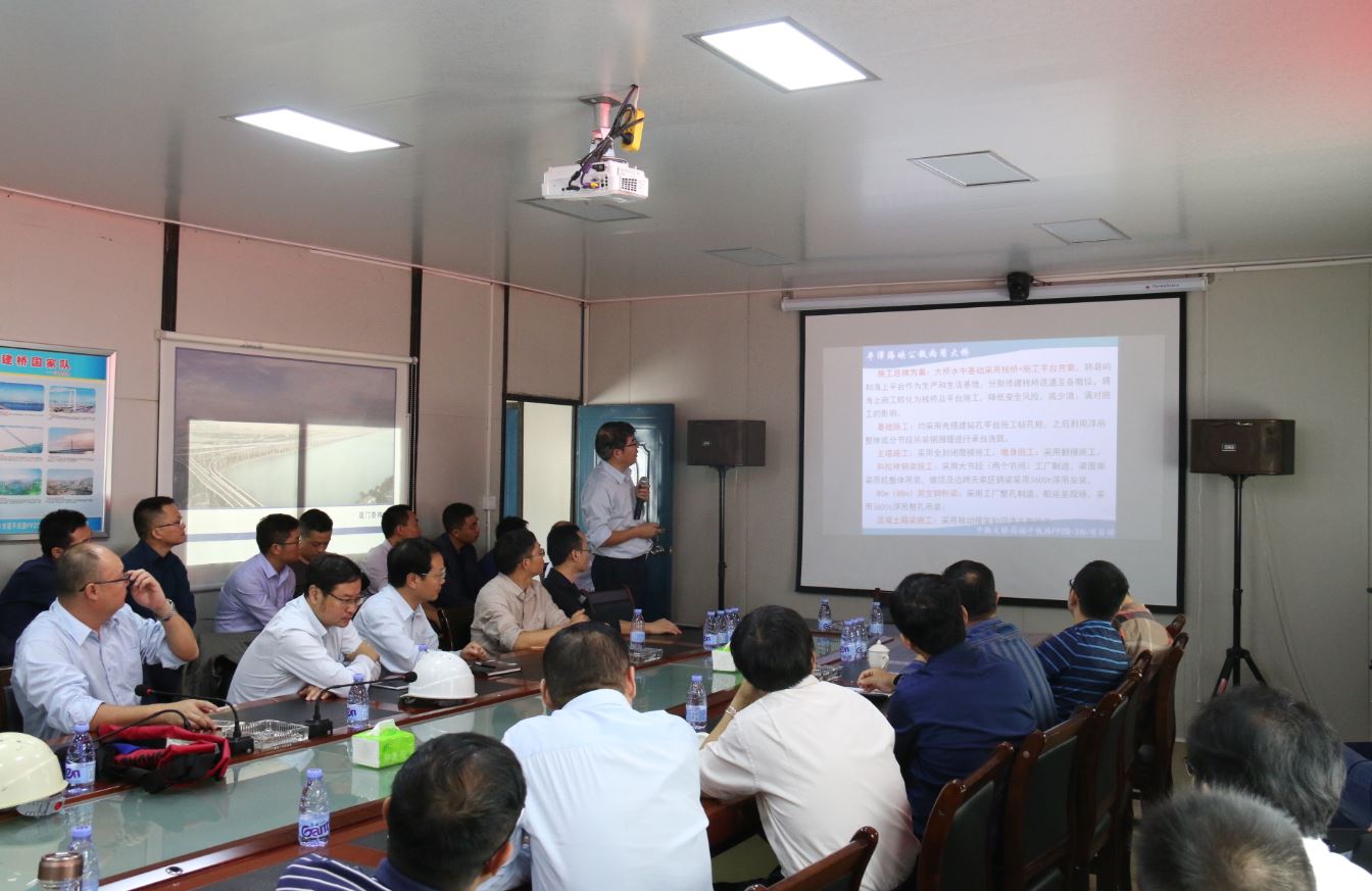 隨后,觀(guān)摩團乘船來(lái)到大橋局福平鐵路FPZQ-3標項目部,在項目會(huì )議室,雙方舉行了觀(guān)摩交流會(huì )議。中鐵大橋局副總工程師兼項目總工程師王東輝用視頻、PPT形式向觀(guān)摩團一行講解了平潭海峽公鐵兩用大橋項目的工程概況及特點(diǎn)和難點(diǎn)、項目主要創(chuàng )新點(diǎn)、項目施工組織管理、主要施工方案、項目質(zhì)量安全管理、四新技術(shù)、科研情況及項目最新進(jìn)展。項目經(jīng)理姚華等就觀(guān)摩人員提出的問(wèn)題一一做了解答,并交流了個(gè)人體會(huì )。