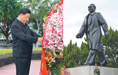 當天下午,習近平來(lái)到蓮花山公園,向鄧小平同志銅像敬獻花籃。習近平緩步走上銅像基座,仔細整理花籃上的紅色緞帶,同大家一起向銅像三鞠躬,表達對鄧小平同志的崇高敬意和深切緬懷。