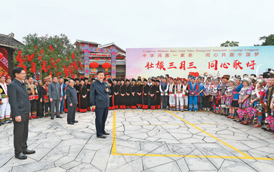 廣西是我國少數民族人口最多的自治區。27日上午,習近平來(lái)到位于南寧市邕江之畔的廣西民族博物館,參觀(guān)壯族文化展。博物館外,三月三“歌圩節”壯族對歌等民族文化活動(dòng)正在這里集中展示。習近平強調,廣西是全國民族團結進(jìn)步示范區,要繼續發(fā)揮好示范帶動(dòng)作用。各民族共同團結進(jìn)步、共同繁榮發(fā)展是中華民族的生命所在、力量所在、希望所在,在全面建設社會(huì )主義現代化國家的新征程上,一個(gè)民族都不能少,各族人民要心手相牽、團結奮進(jìn),共創(chuàng )中華民族的美好未來(lái),共享民族復興的偉大榮光。