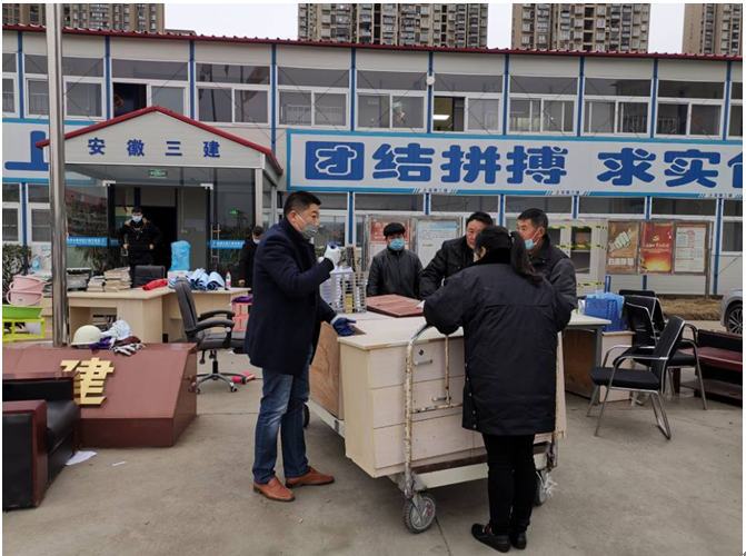 正值大年初一午飯時(shí)間,八公司領(lǐng)導立即在分公司工作群及老年護理院項目工作群發(fā)出通知組織搬遷人員。不到1個(gè)小時(shí),一支十五名管理人員組成的搬遷突擊隊趕到項目部集結完畢,項目經(jīng)理高瑞凱擔任隊長(cháng)。李家保在現場(chǎng)要求管理人員首先要做好個(gè)人防護措施,全部佩戴口罩,同時(shí)要求項目要做好溝通工作,把必要的生活設施及部分辦公設施留給醫護人員使用,堅決支持市二院做好疫情防治工作。突擊隊成員頂著(zhù)雨雪,冒著(zhù)嚴寒,將資料、物品裝箱、編號,重要資料指定專(zhuān)人負責搬運并跟蹤碼放地點(diǎn)。經(jīng)過(guò)三天的緊張整理和搬遷,1月28日晚順利完成兩棟兩層活動(dòng)房辦公物資、臨時(shí)庫房等物資搬遷,并在市二院指定新辦公地點(diǎn)整理完畢,辦公區順利移交。