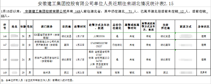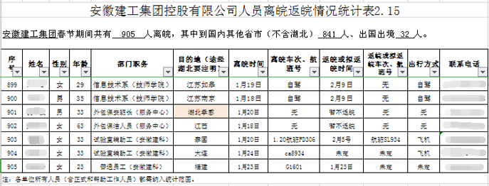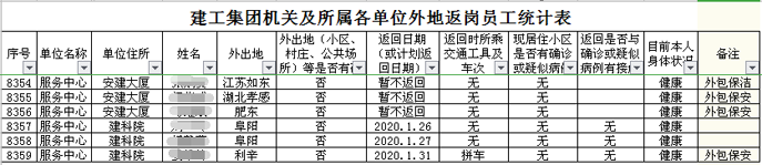 為了做好復工復產(chǎn)準備,2月5日,人員防控組編制了《集團機關(guān)及所屬各單位外地返崗員工統計表》,要求各單位全面統計離開(kāi)工作所在地情況。鑒于建筑行業(yè)特殊性,集團下屬機構眾多,職工人數多,且分散在境外及全國各地,適逢春節往返,人員排查工作量較大,防控壓力較大。為做到摸排全覆蓋,一是要求各單位將在冊在崗員工、勞務(wù)派遣人員、項目外聘人員等全部納入統計范圍,每日更新報送。二是將合肥市區外的四縣一市納入統計范圍,確保全體返崗職工排查全覆蓋,各項防控措施落實(shí)全覆蓋。截至2月15日,集團共有8359位員工離開(kāi)工作地。