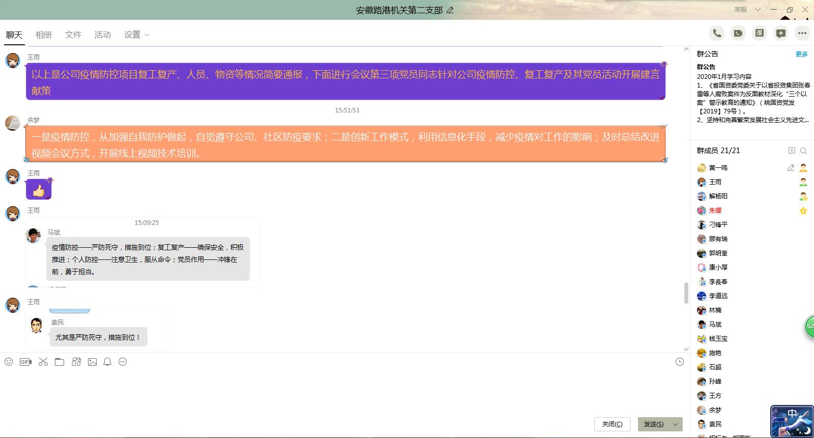 機關(guān)第二黨支部召開(kāi)黨員大會(huì ),為降低染疫風(fēng)險,本次會(huì )議通過(guò)QQ群在線(xiàn)交流,支部黨員就公司疫情防控、復工復產(chǎn)及黨員活動(dòng)積極建言獻策。