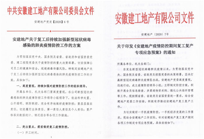 為切實(shí)做到“一手抓疫情防控,一手抓經(jīng)濟發(fā)展”,安建地產(chǎn)先后發(fā)布了《關(guān)于復工后持續加強新型冠狀病毒感染的肺炎疫情防控工作方案》、《安建地產(chǎn)疫情防控期間復工復產(chǎn)專(zhuān)項應急預案》,要求各單位持續做好復工疫情防控,合理組織復工復產(chǎn)。所屬各在單位積極響應,結合實(shí)際情況制定了科學(xué)的復工復產(chǎn)方案,吹響安建地產(chǎn)復工“集結號”!