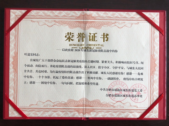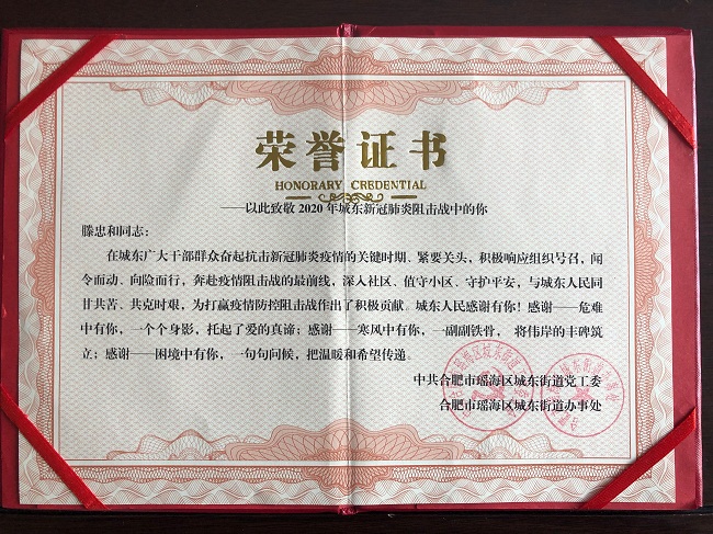 4月26日,中共合肥市瑤海區城東街道黨工委、合肥市瑤海區城東街道辦事處對葉道宏、滕忠和兩名同志在新冠肺炎疫情防控中的突出表現予以表?yè)P,并發(fā)放榮譽(yù)證書(shū),證書(shū)中寫(xiě)道:“城東人民感謝有你!感謝—危難中有你,一個(gè)個(gè)身影,托起了愛(ài)的真諦;感謝—寒風(fēng)中有你,一幅幅鐵骨,將偉岸的豐碑筑立;感謝—困境中有你,一句句問(wèn)候,把溫暖和希望傳遞”。深情的感謝,承載了城東人民無(wú)限的心聲,眾志成城抗疫情,萬(wàn)眾一心戰病魔。同時(shí),希望廣大黨員干部、職工積極向他們學(xué)習,繼續發(fā)揚大公無(wú)私、樂(lè )于奉獻的精神。