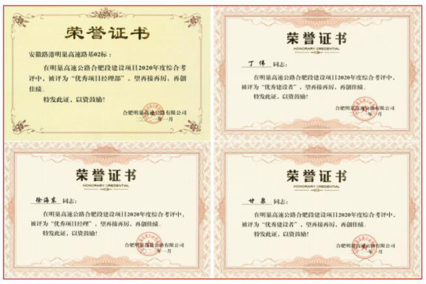 業(yè)主的好評是對我們最大的認可:明巢路基02標在明巢高速公路合肥段項目公司2020年度項目綜合考評比分中排名第一,榮獲“優(yōu)秀項目經(jīng)理部”榮譽(yù)稱(chēng)號,項目部5人榮獲2020年度“優(yōu)秀建設者”榮譽(yù)稱(chēng)號。