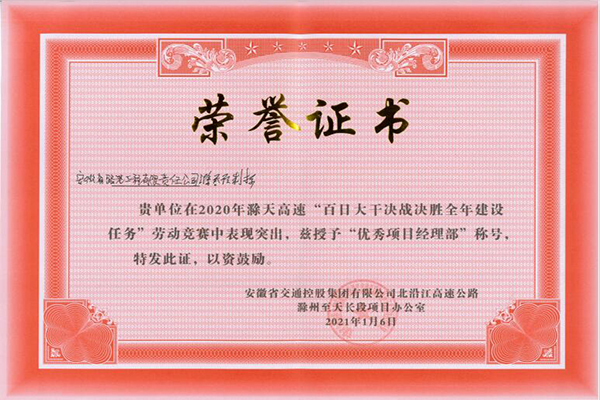 滁天高速02標、滁天高速預制標項目部榮獲安徽交控集團百日大干勞動(dòng)競賽“優(yōu)秀項目經(jīng)理部”稱(chēng)號。