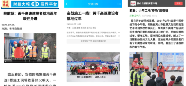 媒體聚焦‖《安徽日報》、《香港商報》等報道路橋集團黃千高速建設者就地過(guò)年暖在身邊