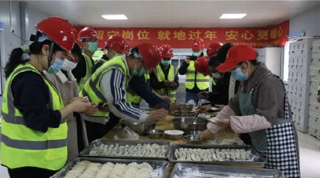 活動(dòng)現場(chǎng),教的人不厭其煩地講,學(xué)的人認認真真地包,大家邊聊邊包,互幫互教,各顯其能,歡聲笑語(yǔ)不絕于耳。今年21歲的項目部安全員徐銀柱去年大學(xué)畢業(yè)就來(lái)到項目部工作,今年也是第一次留在外地過(guò)年?!捌穱L著(zhù)自己親手包的餃子,感受到了濃濃的家鄉味道。在這里我也祝愿我的家人身體健康,萬(wàn)事如意?!倍似馃釟怛v騰的餃子,選擇留在工地過(guò)年的徐銀柱眼角有些濕潤。也是在這一刻,家人般的團圓餃子讓彼此的心走得更近。