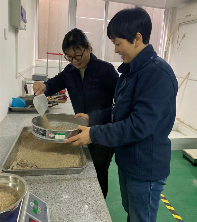 工程研究院實(shí)驗室職工袁家敏與楊珣正在集料室做砂子篩分析試驗