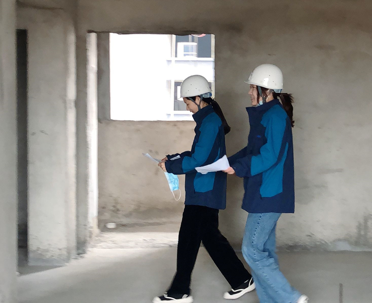 八公司臨泉銀杏苑項目資料員程妙錚、陸晴復核現場(chǎng)標高、開(kāi)間、凈高