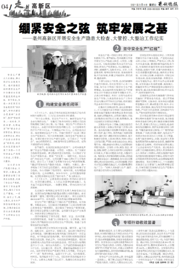 年后復工不久,亳州市高新區即對轄區內的施工單位進(jìn)行逐個(gè)復工復產(chǎn)以及安全生產(chǎn)隱患大檢查、大管控、大整治。3月3日上午,亳州市高新區建管主任、第五管理中心主任、環(huán)保中心主任等領(lǐng)導以及亳州市記者來(lái)到亳州濱江壹號項目進(jìn)行實(shí)地現場(chǎng)檢查,并采訪(fǎng)了項目經(jīng)理朱曉亮。在聽(tīng)取項目匯報、查閱安全管控資料后,當地各主管部門(mén)領(lǐng)導充分肯定了項目在現場(chǎng)安全、環(huán)保管控等方面的有力舉措,并在亳州晚報上刊登了項目全方位的安全管理體系。
