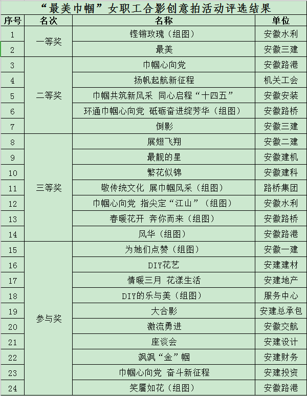 “巾幗心向黨·奮斗新征程”婦女節主題慶祝系列活動(dòng),“最美巾幗”女職工合影創(chuàng )意拍評選結果揭曉。本次活動(dòng)以致敬建黨100周年、巾幗展風(fēng)采為主題,以團隊創(chuàng )意拍的形式,集中展現建工女職工愛(ài)黨愛(ài)國愛(ài)企的熱情,營(yíng)造了生動(dòng)活潑、妙趣橫生的文化氛圍?;顒?dòng)得到了各級工會(huì )積極響應,受到女職工們的歡迎,共有來(lái)自所屬單位和集團機關(guān)的84幅作品參賽,經(jīng)綜合評選,最終評出一等獎2名,二等獎5名,三等獎7名,評選結果如下: