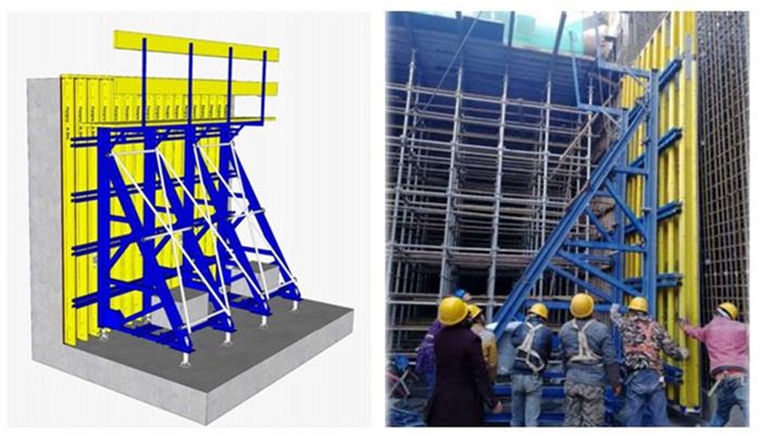 采用定型化模板施工。傳統國內地下工程模板支架多采用鋼管架(或碗扣架)+木模板的形式,人材機投入大,安拆周期長(cháng),而且搭設過(guò)程中控制細節多,質(zhì)量不易保證,安全風(fēng)險大。為此軌道交通項目側墻施工采用大膠合板+木工字梁+桁架支撐的單側模板臺車(chē)體系。其組裝簡(jiǎn)便,利于現場(chǎng)快節奏的流水施工;整體承載力較大,能抵抗不同混凝土側壓力;可變高度,可適應不同墻體高度;可利用小型輪車(chē)進(jìn)行整體轉移,節省現場(chǎng)塔吊臺班量;采用在板上預埋錨固裝置,側墻上無(wú)需預埋,可完全實(shí)現清水墻效果。據統計平均每塊墻板縮短工期約10天。在保證質(zhì)量的同時(shí)極大縮短工期。