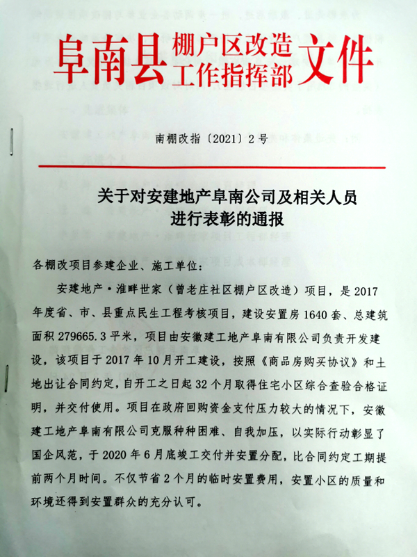 安建地產(chǎn)·淮畔世家項目喜獲阜南縣棚改指揮部通報表彰