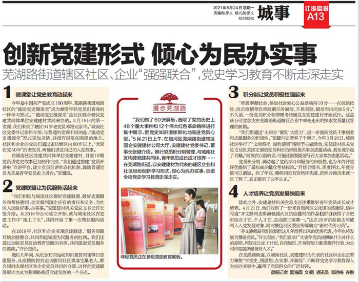 2021年5月24日,《江淮晨報》以“創(chuàng )新黨建形式、傾心為民辦實(shí)事”為題,專(zhuān)題報道安建建材黨史學(xué)習教育開(kāi)展情況?!督闯繄蟆分赋?,在蕪湖路街道,以城南社區、安建建材為代表的的社區和企業(yè)紛紛創(chuàng )新學(xué)習形式,著(zhù)力聚焦“學(xué)黨史、悟思想、辦實(shí)事、開(kāi)新局”,不斷推進(jìn)黨史學(xué)習教育走深走實(shí)。同時(shí)也在學(xué)習強國合肥市學(xué)習平臺進(jìn)行報道。
