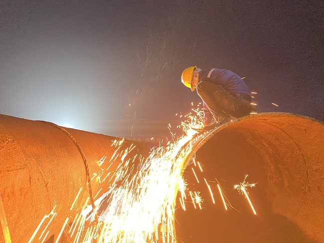 為了保證后期主塔和上橫梁施工的順利往前推進(jìn),在管樁加工安裝之前,項目部對現場(chǎng)的施工技術(shù)人員進(jìn)行了詳細的技術(shù)交流和交底。項目部全體員工發(fā)揚連續作戰精神,全力奮戰在施工一線(xiàn),鼓足干勁,搶抓工期。施工現場(chǎng),白天機械轟鳴,夜晚挑燈夜戰,參建人員放棄休息,不畏艱難,爭分奪秒,以流水作業(yè)的方式進(jìn)行鋼管樁的連接、拼裝和連接系的加工、安裝等工作。同時(shí),項目部備足了物資、機具、材料以及充足的防暑食品及藥物,安排專(zhuān)人負責協(xié)調,保障職工的身體健康,為現場(chǎng)施工保駕護航。