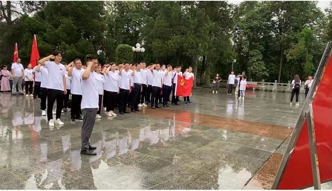 參觀(guān)展覽結束后,全體同志沿循環(huán)步道祭奠參觀(guān)了紅軍烈士墓園。園內安葬革命烈士和已故老紅軍近200位,同志們身臨其境地感受到金寨紅軍烈士忠貞不屈、甘于奉獻的高貴品格和革命精神。在洪學(xué)智將軍紀念碑前,同志們分批進(jìn)行了默哀與致敬鞠躬。青松翠柏旁,莊嚴肅穆地回顧了兩膺上將的共和國領(lǐng)導人的光輝一生,感慨良多。兩名黨員代表向革命烈士敬獻花籃,分公司副書(shū)記、總經(jīng)理代杰上前整理緞帶。隨后,全體同志面向烈士紀念碑三鞠躬,并莊嚴宣誓,重溫入黨誓詞,堅定入黨初心。