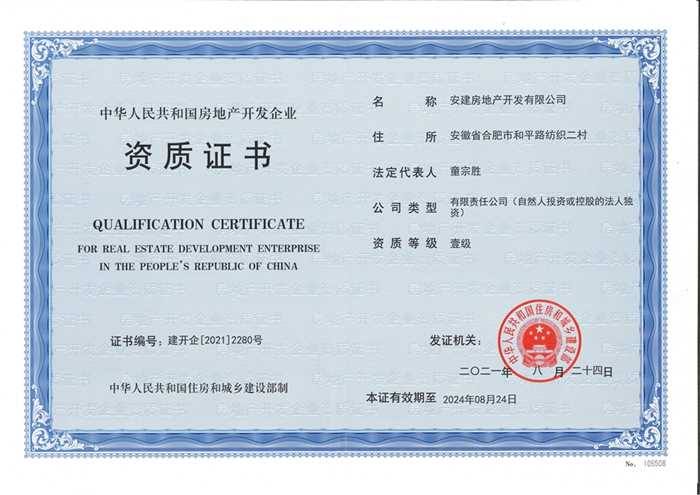 2021年9月6日,安建地產(chǎn)正式獲得國家住房和城鄉建設部頒發(fā)的房地產(chǎn)開(kāi)發(fā)一級資質(zhì)企業(yè)證書(shū),標志著(zhù)安建地產(chǎn)資質(zhì)升級建設取得了全面成功,公司已達到房地產(chǎn)行業(yè)資質(zhì)的最高級別。