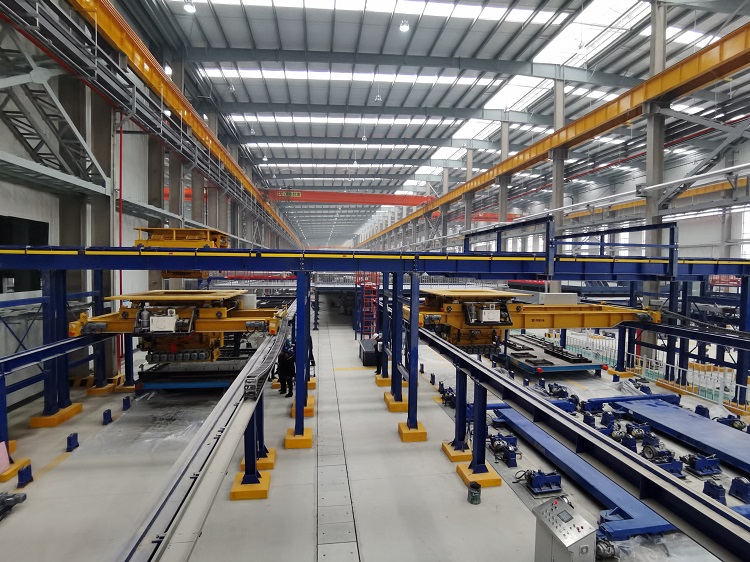 北城工業(yè)公司從整體到布局完成了生產(chǎn)工藝大改革。將傳統單一生產(chǎn)線(xiàn)采改為綜合構件生產(chǎn)流水線(xiàn),保證一線(xiàn)多類(lèi)構件同時(shí)生產(chǎn),實(shí)現了異形構件同點(diǎn)混凝土澆筑工藝;混凝土飛船從單線(xiàn)轉為雙線(xiàn)運輸,實(shí)現多線(xiàn)混凝土同時(shí)澆筑;養護窯更改為高倉位下沉式養護窯,充分利用地下空間,提高倉位空間使用率,單線(xiàn)實(shí)現同時(shí)養護57座模臺,并可實(shí)現異型構件進(jìn)窯護養護;考慮到廠(chǎng)區占地面積減少,為提高空間利用率,設計采用了大面積連通式鋼平臺,并配有帶軌道運輸車(chē),大大提高了材料存放、運輸效率;桁架筋自動(dòng)生產(chǎn)設備、網(wǎng)片自動(dòng)焊接生產(chǎn)設備、管片鋼筋自動(dòng)切割分揀彎弧設備,實(shí)現了鋼筋智能化加工?;炷翑嚢铏C從立軸攪拌改為雙臥軸攪拌,實(shí)現混凝土強制拌合;蒸汽養護從市政公用改為自有式多聯(lián)機組蒸汽發(fā)生器,靈活使用,節約成本;貨場(chǎng)桁吊由單梁改為雙梁懸臂吊,擴大吊運范圍,實(shí)現構件無(wú)障礙倒運。攪拌站擁有全封閉的上料系統,有9個(gè)骨料倉和2個(gè)輸送線(xiàn)組成,大噸位多組料倉可大量?jì)Υ嬖牧?,全封閉自動(dòng)上料系統,無(wú)粉塵,實(shí)現綠色環(huán)保。