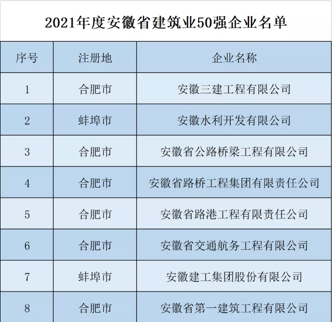 2月10日,省住房城鄉建設廳公布2021年度安徽省建筑業(yè)10強縣(市)、10強區、50強企業(yè)名單,建工控股共有8家單位入選2021年度安徽省建筑業(yè)50強企業(yè)。
