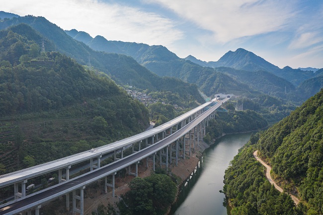 此次觀(guān)摩學(xué)習點(diǎn)傍山橋,位于大洲源北岸典型傍山陡坡沿河路段狹窄走廊帶,采用裝配式懸挑路基結構為全國首創(chuàng )。設計2處裝配式懸挑結構及37個(gè)寬翼展花瓶墩結構,與右半幅形成高低分離式疊合路基,施工工藝新穎,技術(shù)復雜,難度大。