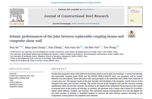 綠色建筑與裝配式建造安徽省重點(diǎn)實(shí)驗室結構抗震課題組關(guān)于雙鋼板混凝土組合墻-可更換連梁節點(diǎn)的研究成果在國際學(xué)術(shù)期刊《Journal of Constructional Steel Research》(中科院二區, IF =4.349)上發(fā)表,論文題為“Seismic performances of the joint between replaceable-coupling beams and composite shear wall”,徐丹博士為該論文第1作者,項炳泉正高工、王濤研究員、種迅教授、嚴加寶教授和徐開(kāi)元博士為共同作者。該項工作得到了國家杰出青年基金、國家自然科學(xué)基金、黑龍江頭雁計劃和安徽省重點(diǎn)實(shí)驗室開(kāi)放基金等項目的資助。