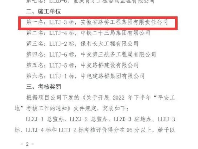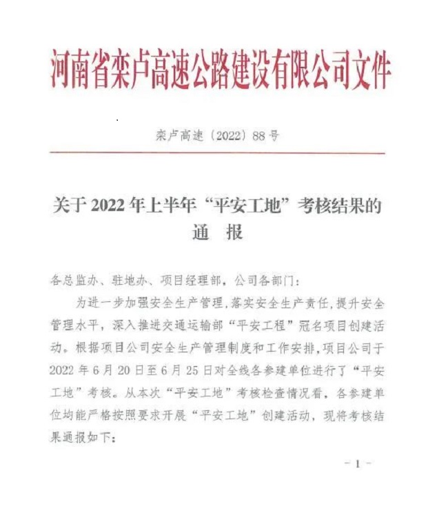 近日,河南省欒盧高速建設有限公司組織欒盧高速項目6個(gè)標段開(kāi)展2022年上半年平安工地考核,安徽路橋集團欒盧高速03標段喜獲全線(xiàn)“第一名”的傲人成績(jì),有力彰顯了公司企業(yè)形象。