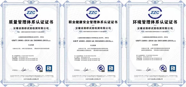 2022年8月,安徽路橋集團檢測公司通過(guò)ISO9001質(zhì)量管理體系、ISO14001環(huán)境管理體系、ISO45001職業(yè)健康安全管理體系認證。
