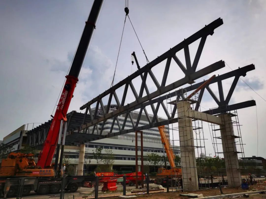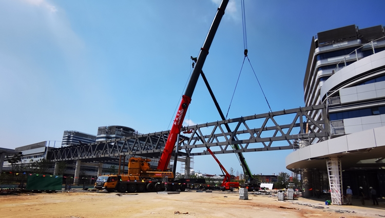 本工程南北區連廊采用鋼桁架連廊,桁架總跨度105.551m,桁架高5m,分3段吊裝,第一段跨度40.599m,第2段跨度35.293m,第3段29.066m,單榀桁架最重52t,采用600噸汽車(chē)吊吊裝,吊裝工作半徑25m。吊裝前,對吊裝區域全封閉,拉設警戒線(xiàn),管理人員全部到位,各司其職。吊裝過(guò)程嚴格按照各方簽認的施工方案實(shí)施,對吊裝過(guò)程中出現的技術(shù)難題逐一解決;安全方面,邀請公司、分公司安全管理人員進(jìn)行專(zhuān)業(yè)指導。經(jīng)過(guò)多方努力,最終鋼連廊順利吊裝完成。