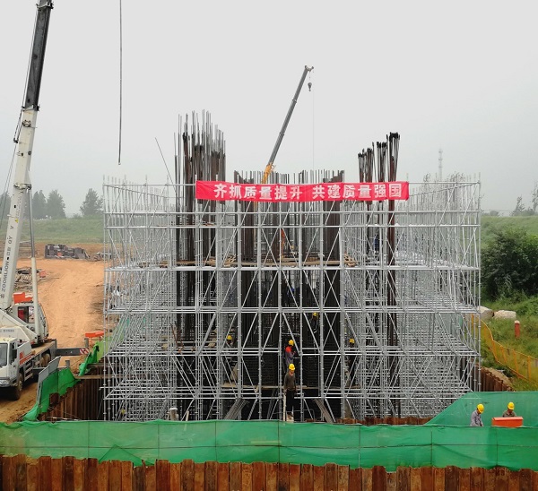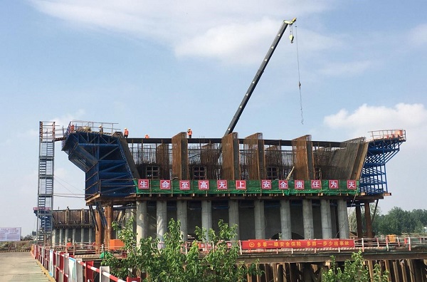 經(jīng)過(guò)技術(shù)分析、經(jīng)濟對比,安徽路港公司自主研發(fā)出“復雜水域大跨度寬幅現澆箱梁大型掛籃的施工方法”、“大懸臂斜腹板寬幅箱梁工程施工”、“柱墩復合式現澆支架0#塊工程施工臨時(shí)固結工藝”、“墩身模板采用墩身花瓶形式的定型大塊鋼模板拼裝”、“承臺鋼筋綁扎采用一種帶有立柱、梳齒板、鋼筋限位件的鋼筋綁扎定位裝置實(shí)現精確綁扎”等一系列施工新技術(shù)。