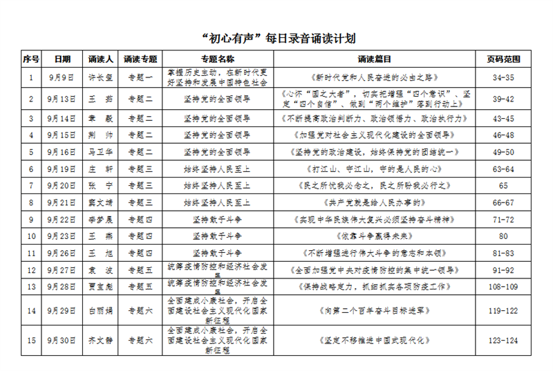 堅持深學(xué),開(kāi)設“初心有聲”,每日錄音誦讀,增強學(xué)的深度。每日組織一名機關(guān)黨員(發(fā)展對象、積極分子)錄制《習近平談治國理政》第四卷中指定篇目的誦讀音頻,并發(fā)送至機關(guān)工作群內,共沐書(shū)香、領(lǐng)會(huì )要義。引導廣大黨員(發(fā)展對象、積極分子)讀原著(zhù)學(xué)原文、悟原理知原義,真正做到虔誠而執著(zhù)、至信而深厚。截至目前已錄制11期,已分享7期,黨員參與熱情較高,效果良好。