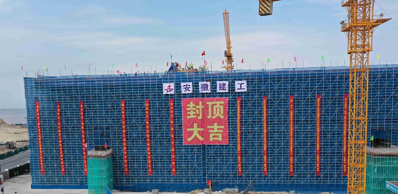 本項目于2021年10月15日正式開(kāi)工,在集團公司、縣委縣政府和有關(guān)單位的關(guān)心指導下,各參建單位凝心聚力,攻堅克難,嚴格按照施工組織設計和專(zhuān)項施工方案推進(jìn)項目建設,克服了海島施工各項難題,順利實(shí)現主體結構封頂。
