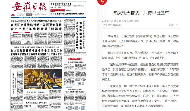10月5日,《安徽日報》頭版以《熱火朝天奮戰,只待早日通車(chē)》為題,報道路橋集團項目亳蒙高速建設者克服高溫天氣,奮戰在施工建設一線(xiàn),確保項目建設持續推進(jìn)的奮斗場(chǎng)面。稿件獲中安在線(xiàn)、安徽青年網(wǎng)、亳州新聞網(wǎng)等主流媒體轉載。