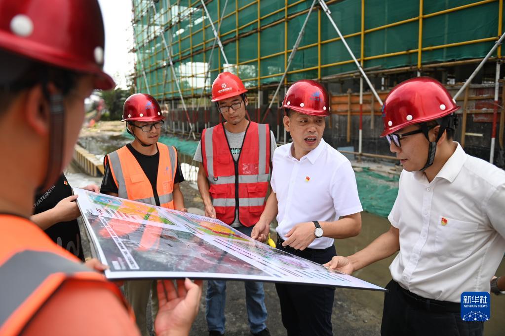 在浙江省寧波市奉化區蕭王廟街道滕頭村,二十大代表、滕頭村黨委書(shū)記、村委會(huì )主任傅平均(右二)在村黨群服務(wù)中心大樓建設工地察看施工進(jìn)展(2022年9月16日攝)。新華社記者 黃宗治 攝