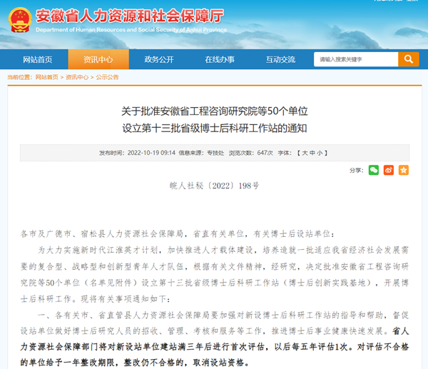 近日,安徽省人力資源和社會(huì )保障廳發(fā)布了《關(guān)于批準安徽省工程咨詢(xún)研究院等50個(gè)單位設立第十三批省級博士后科研工作站的通知》(皖人社秘〔2022〕198號),安徽路港公司作為本批次唯一一家施工企業(yè)光榮上榜,獲批設立省級博士后科研工作站。