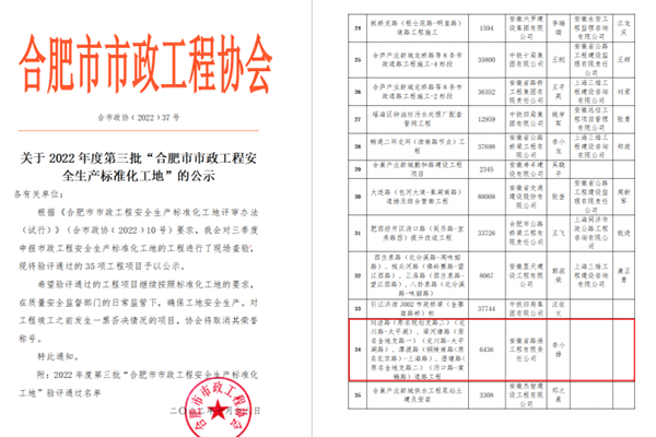 近日,合肥市市政工程協(xié)會(huì )傳來(lái)喜訊,由安徽路港承建的潭渡路等十二條道路施工總承包項目榮獲“合肥市市政工程安全生產(chǎn)標準化工地”稱(chēng)號。