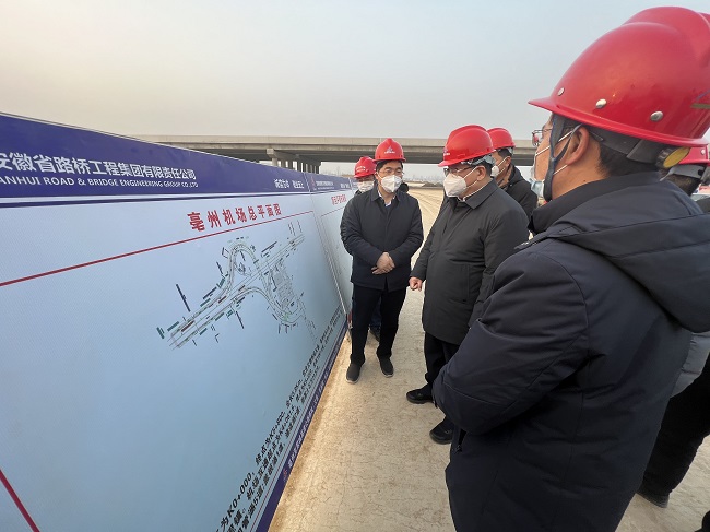 1月9日下午,亳州市委書(shū)記杜延安一行赴安徽路橋集團亳蒙高速01標項目調研指導,市發(fā)展改革委、市自然資源和規劃局、市住房城鄉建設局、市交通運輸局和市城市管理局主要領(lǐng)導等參加調研。