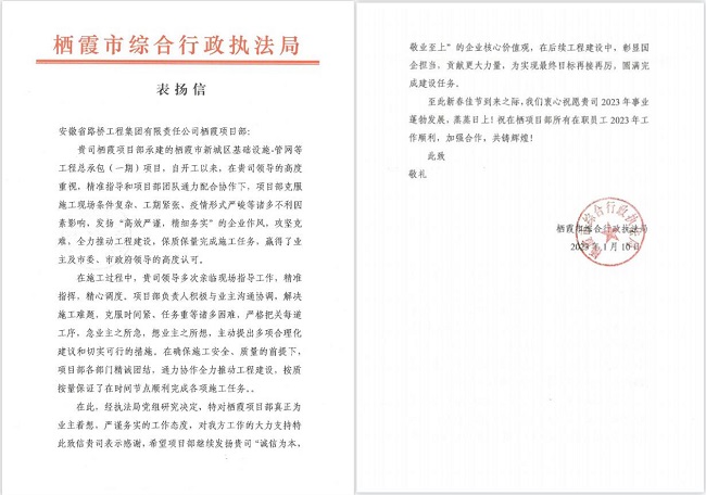 信中,對路橋集團所屬項目在施工進(jìn)度、質(zhì)量、安全、環(huán)保等方面的優(yōu)異表現給予充分肯定和表?yè)P,對公司及項目管理團隊的付出和努力表示感謝。