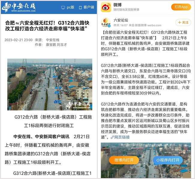 2月22日,中安在線(xiàn)以《合肥往返六安全程無(wú)紅燈!G312合六路快改工程打造合六經(jīng)濟走廊幸?!翱燔?chē)道》為題,報道路橋集團舉行開(kāi)工儀式,介紹項目工程意義。